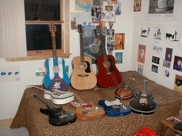 (left to right) Kasino 1/4 size, Paradise tres, Homemade Cuatro, Mullet Homemade Guitar, Washburn D-10, Squier/Fender Telecaster, Guild D-10, Samick Mandolin, Epiphone Les Paul Custom Series.